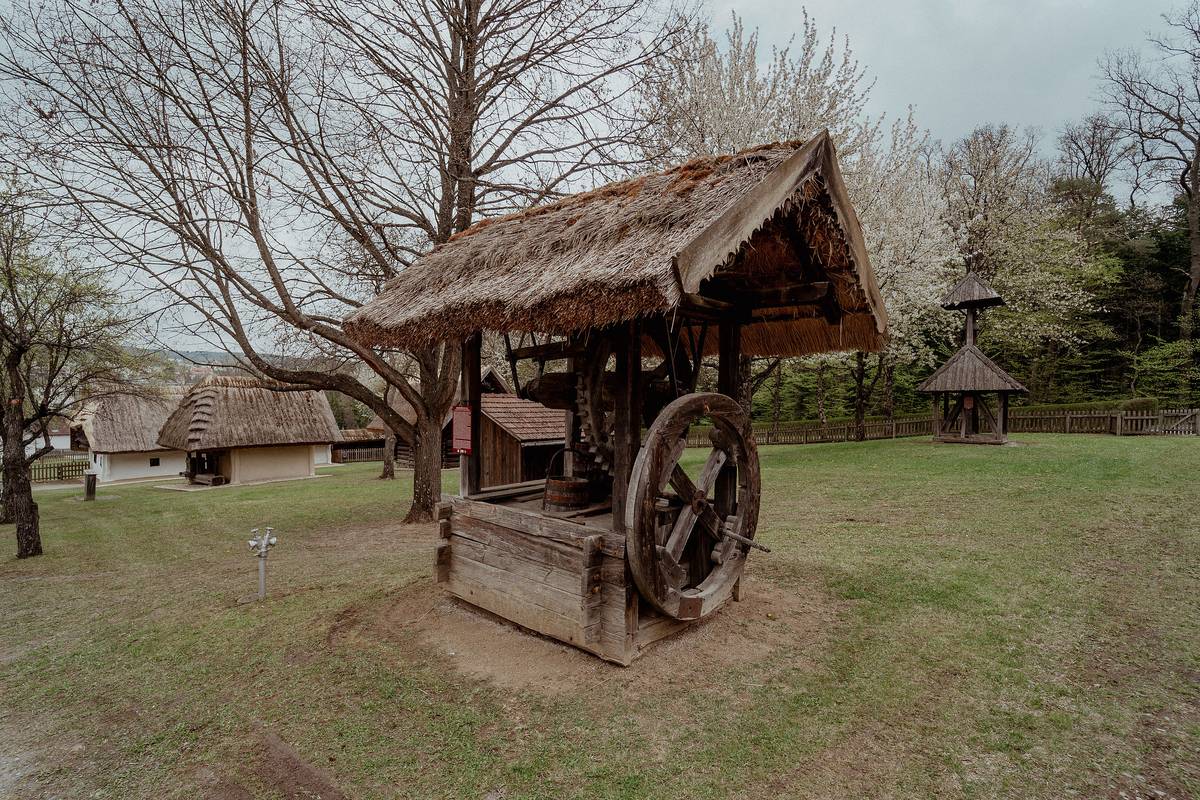 Das Zahnradgetriebe stammt vermutlich aus dem frühen 19. Jahrhundert, der Aufbau und der Brunnenkasten wurden nachgebildet. Der Brunnen wurde oft von mehreren Familien genutzt und war daher von der Straße aus zugänglich.